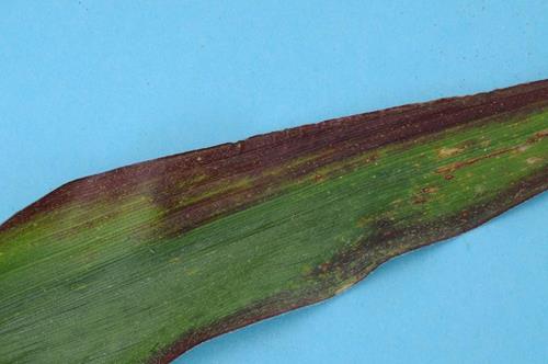 Tissue on the leaf base and along the main vein is dark green, while the marginal, interveinal area towards the leaf tip shows a distinct purple tint. By the time, the discoloration spreads over the entire leaf blade.