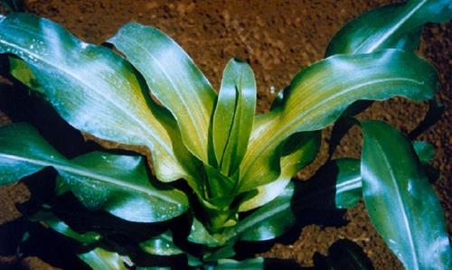 Pale yellow chlorotic zones running parallel to the midrib starting at base of leaves. Leaf margin, tip and midrib remain green. The youngest developing leaves may be totally clorotic yellow or white ('white bud'). A reddish to necrotic brown discolouration at the leaf margins and the stems may develop on basal plant parts, when deficiency is severe.