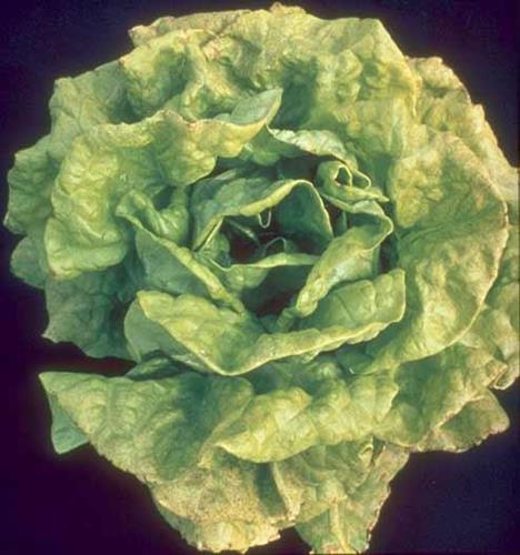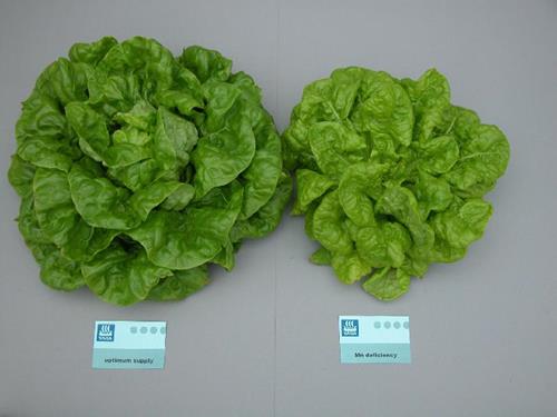 Sulphur deficiency also causes a yellowish color of the lettuce leaves, but in this case the symptoms start at the younger leaves and growth is more restricted.