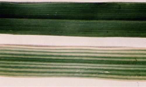 Potassium deficiency results in a characteristic pattern of leaf discoloration by small whitish-yellow spots, followed by scorching or browning of the leaf edge of lower, older leaves. Intercostal chlorosis occurs toward the leaf base.