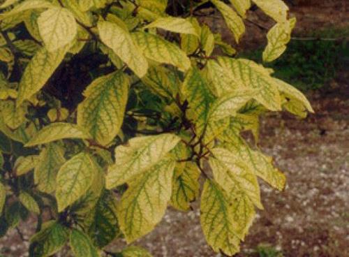The severity of the chlorosis increases towards the youngest leaves at the tip of the shoot.
