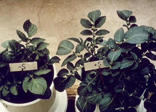 The pale green/yellow leaves (left) are reduced in size and growth may be stunted. Often seen on younger leaves first.