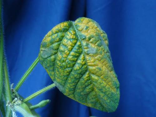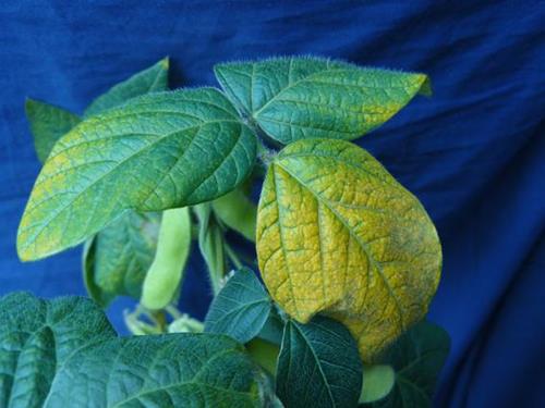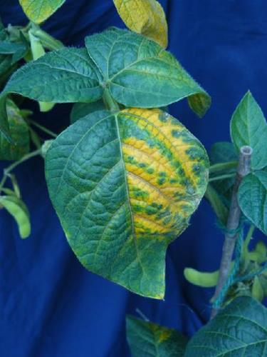 Some leaf blades in the upper and medium height show irregular yellow discolorations. In the present case, an interveinal chlorosis produces a mottled appearance.