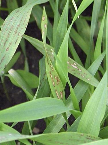 Leaves have grey specks or light brown lesions and they break/bend over near the centre section. Some leaves show signs of chlorosis which eventually hides the lesions.